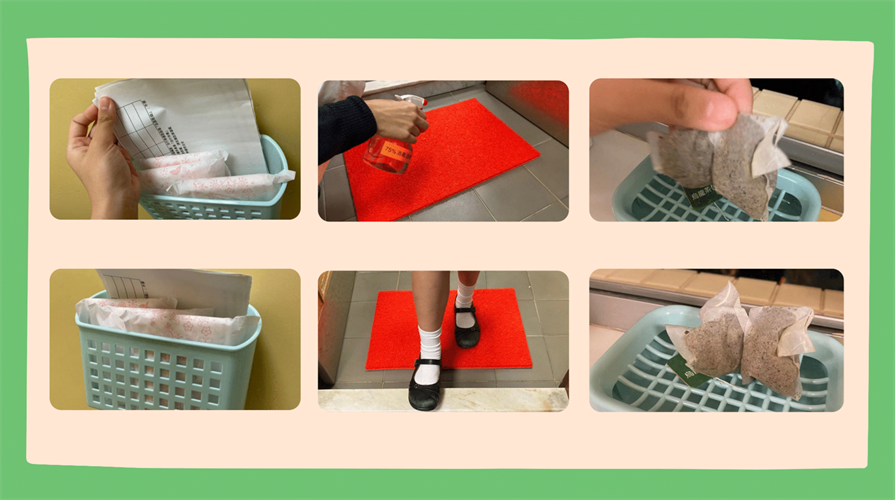 Sanitary napkins were wrapped in waste paper and secured with tape. Disinfectant mats were used to address the issue of dirty shoes. Tea bags were used to address the problem of unpleasant smell in the toilets. After that, the toilets became cleaner. A more hygienic learning environment was provided for students.
